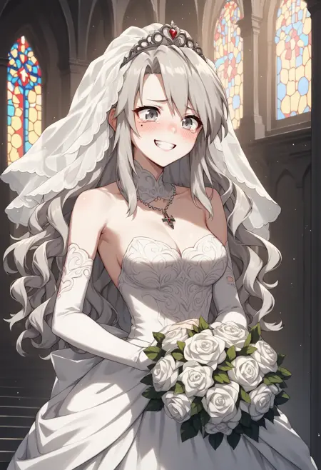 Asc3: 창백한 피부, 회색 눈, 회색 머리카락, 긴 머리카락, 곱슬머리, 눈 밑 점, 갑옷, 가슴 노출, 갑옷 드레스, 흰 치마, 장갑