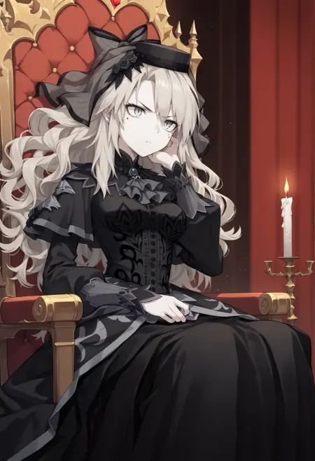 Asc1: 창백한 피부, 회색 눈, 회색 머리카락, 긴 머리카락, 곱슬머리, 눈 밑 점, 땋은 머리, 모자, 베일, 장미, 검은 드레스, 애스콧, 캐플렛, 긴 치마, 고딕 스타일