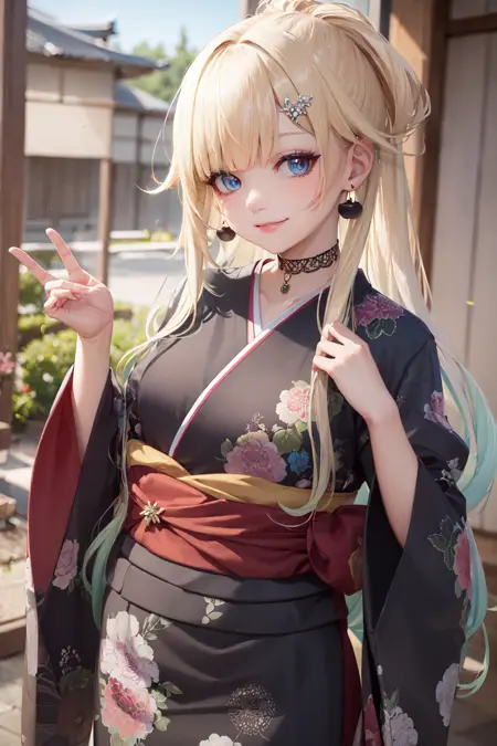 默认服装: 发饰, 连衣裙, 手套, 黑色颈圈, 首饰, 耳环