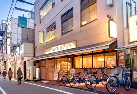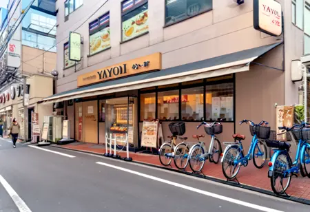 yayoiken, storefront, bicycle, scenery, outdoors, street, building, sign, door, utility pole, shop, city, power lines, lamppost
