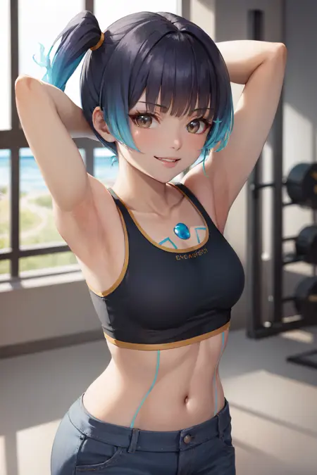 기본 의상: 재킷, 크롭탑, 반바지, 무릎높이 양말, 팔꿈치 장갑