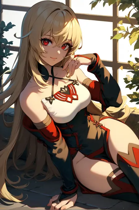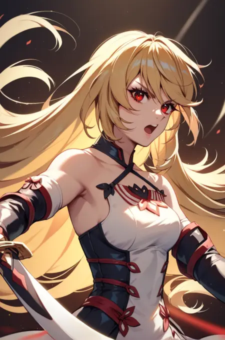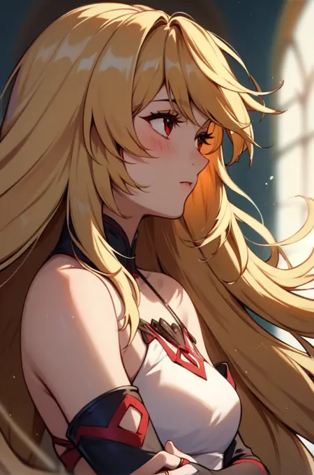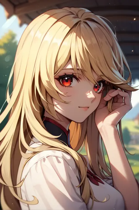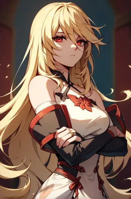 millaFracture, long hair, blonde hair, red eyes, bangs,