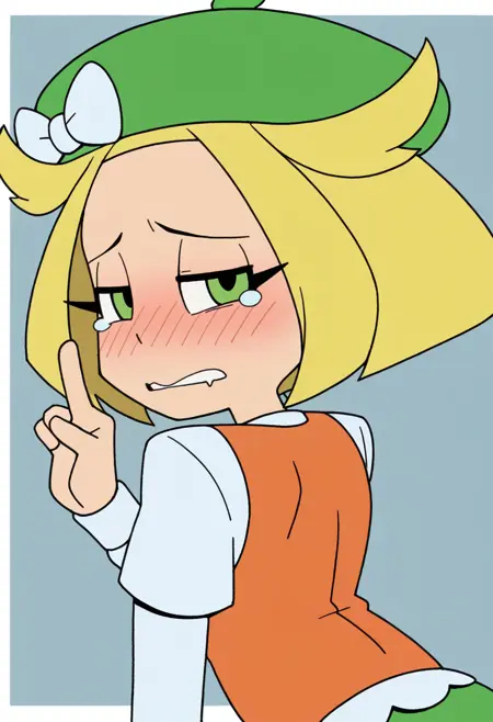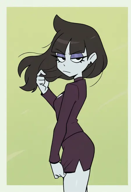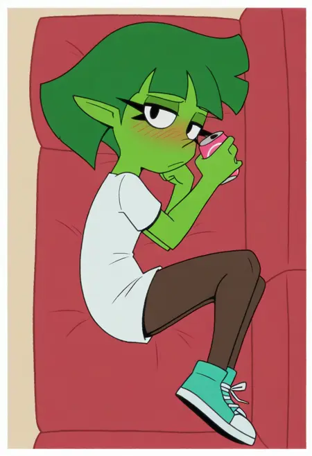 玛戈,绿色皮肤,绿色头发,紫色眼影,黑色眼睛,波波头,尖耳朵,