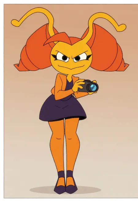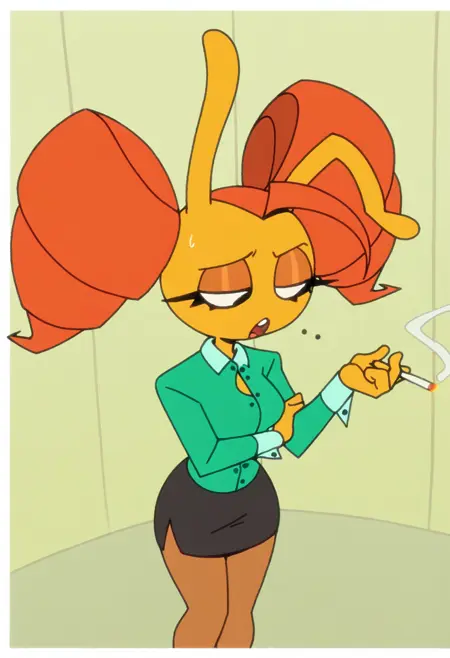 ula, yellow skin, orange hair, drill hair, antennae, black eyes, looking at viewer, light smile, no ears, twintails,