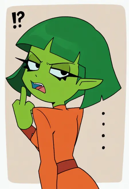 margo, green skin, green hair, purple eyeshadow, black eyes, bob cut, pointy ears,