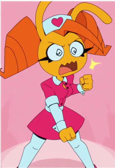 乌拉,黄色皮肤,橙色头发,钻头发型,天线,黑色眼睛,看着观众,微微一笑,无耳朵,双马尾,