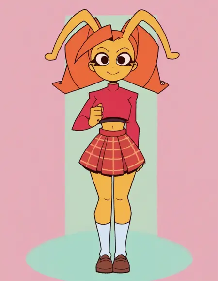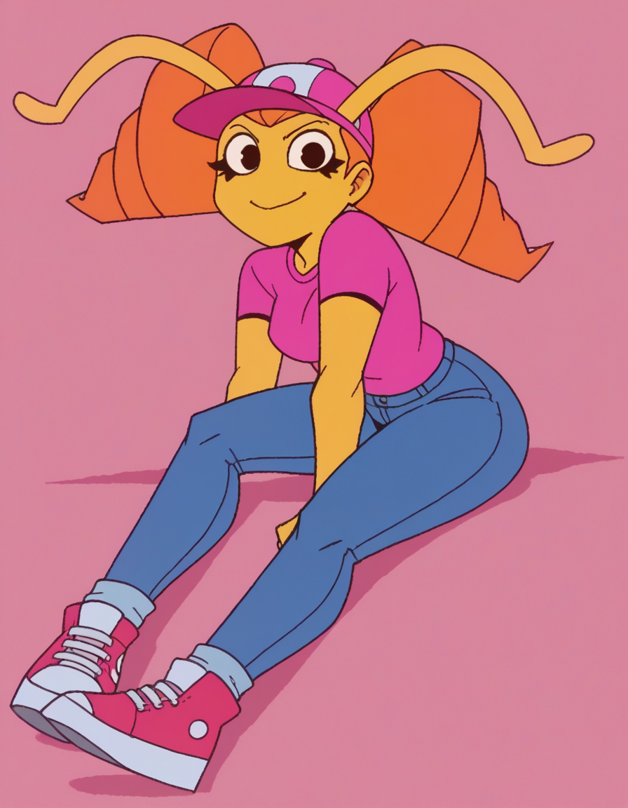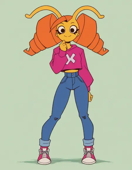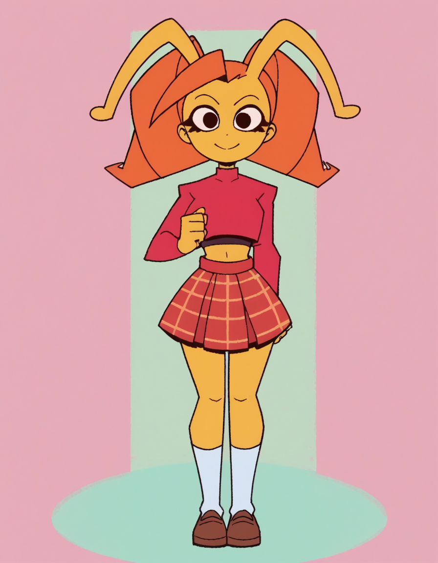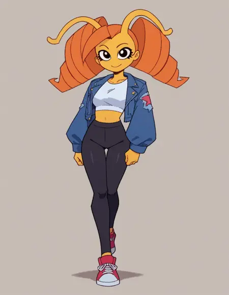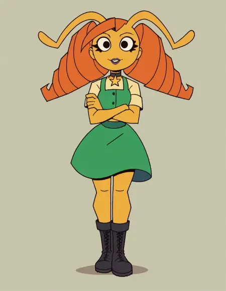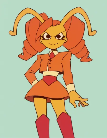 ula, yellow skin, orange hair, drill hair, antennae, black eyes, looking at viewer, light smile, no ears, twintails,