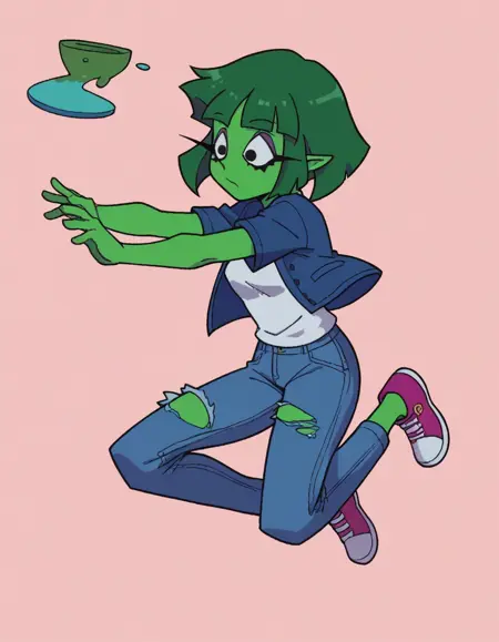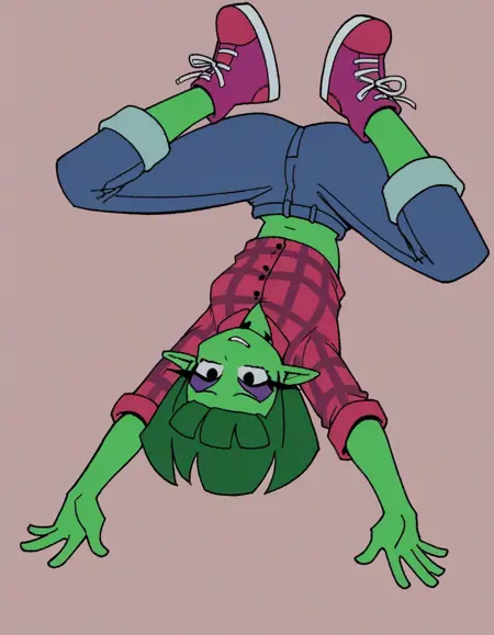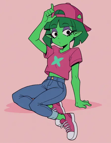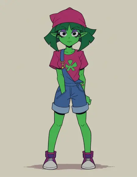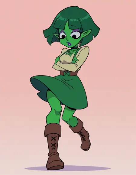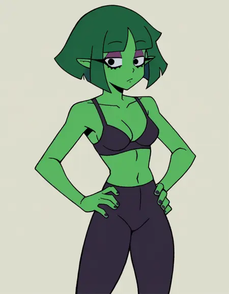 margo, green skin, green hair, purple eyeshadow, black eyes, bob cut, pointy ears,
