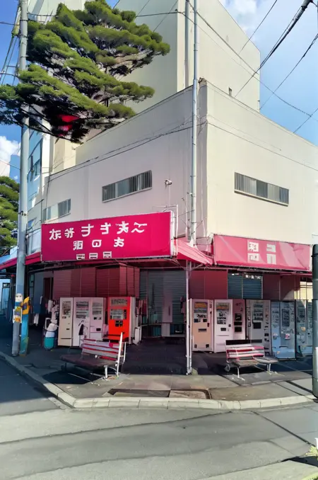 ishidakeiran,戶外,電線,風景,電桿,天空,道路,地面車輛,自動售貨機,建築物,白天,街道,機動車,藍天,商店,招牌,汽車,樹木,雲,外景