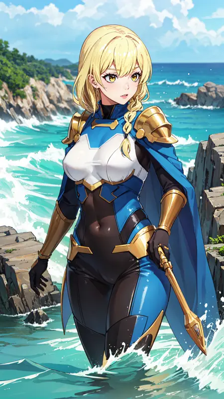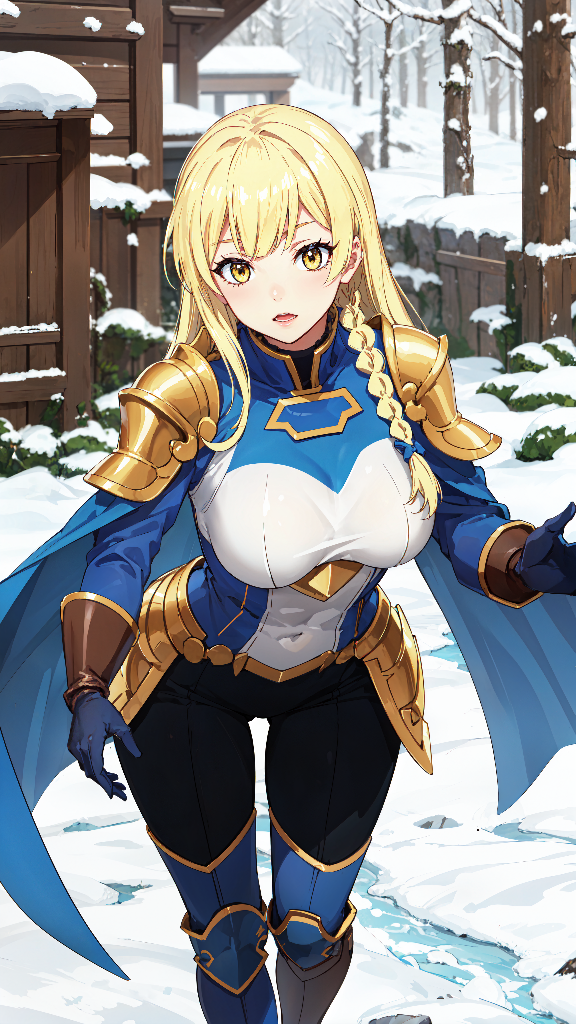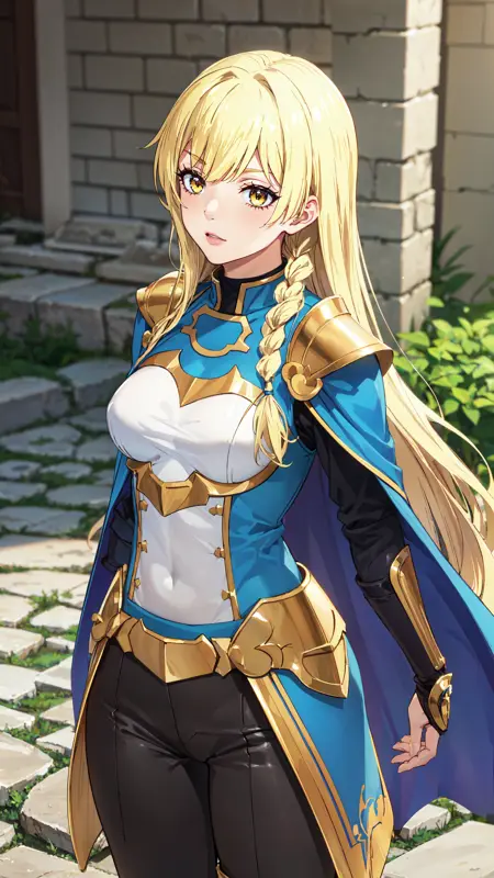 long hair, blonde hair, yellow eyes, braid, blue and white outfit, gold shoulder pads, blue cape, black pants