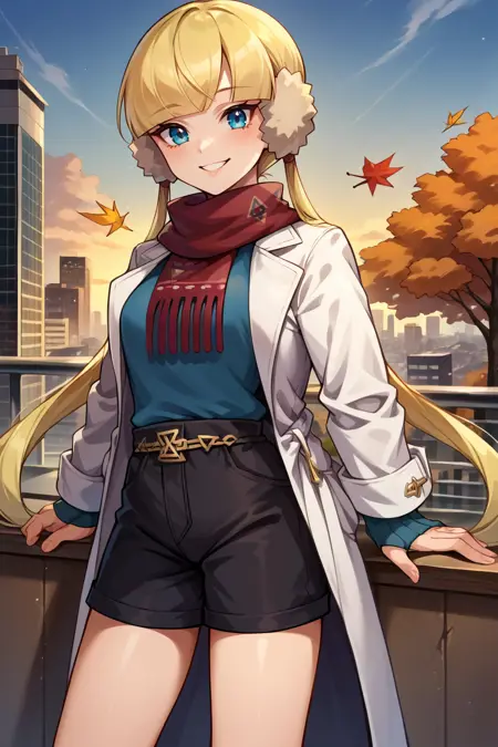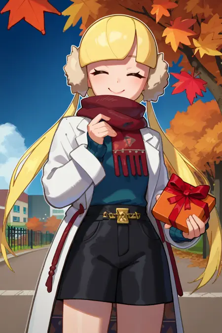 팔렌타인 2023 외모를 원할 경우 "palEle, 금발, 귀마개, 트윈테일, 빨간 스카프, 하얀 코트, 파란 셔츠, 검정 반바지"를 추가하세요.