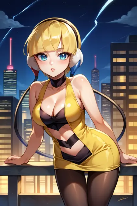 BW1 외모를 원할 경우 "bw1ele, 금발, 단발, 헤드폰, 케이블, 초크, 흉부 노출, 검정 및 노랑 드레스, 짧은 드레스, 의상 컷아웃, 배꼽 컷아웃, 민소매, 팬티스타킹"을 추가하세요.