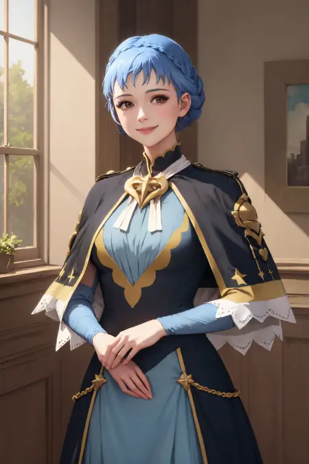 时间跳跃后: mariannetimeskip, crown braid, blue dress, long sleeves, capelet