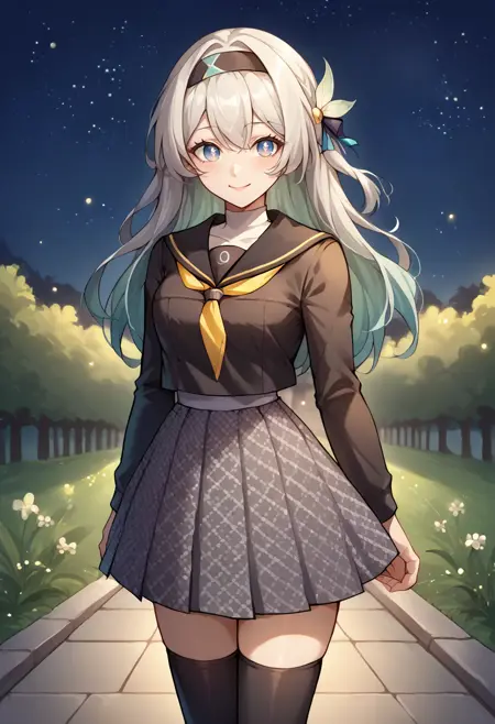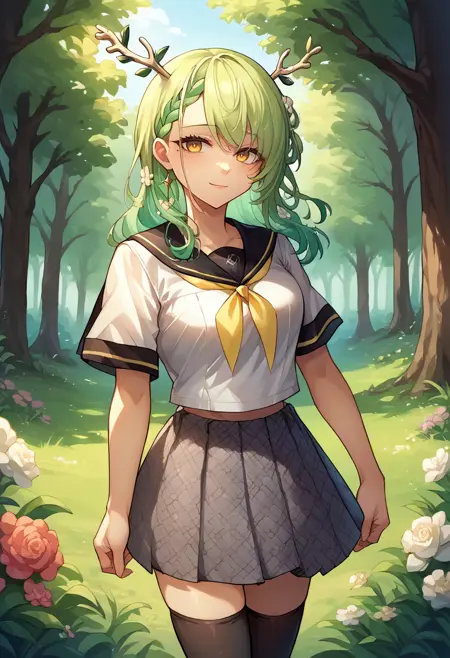 YasogamiFemaleSummer, white shirt, short sleeves, black sailor collar, yellow neckerchief, grey skirt, black thighhighs