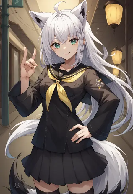 YasogamiFemaleWinter, black shirt, long sleeves, black sailor collar, yellow neckerchief, grey skirt, black thighhighs