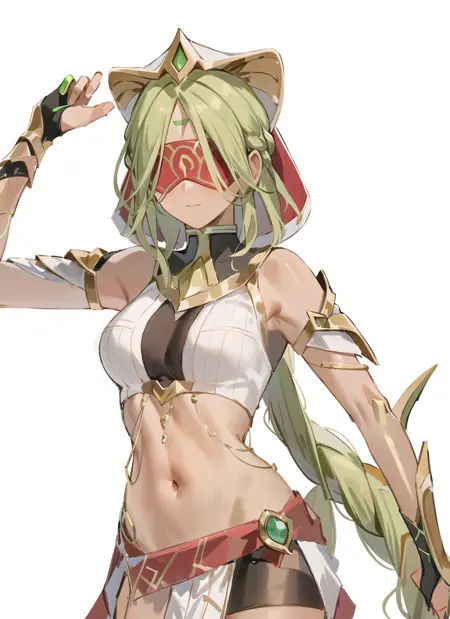 red blindfold, twin braids, armlet, fingerless gloves, headdress