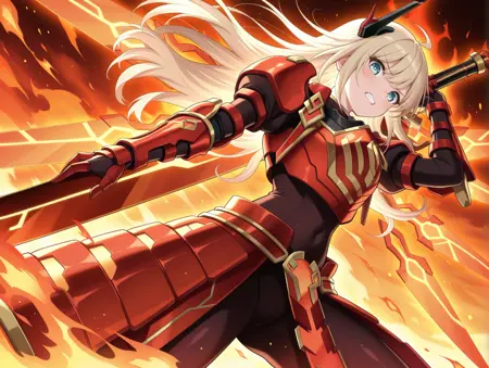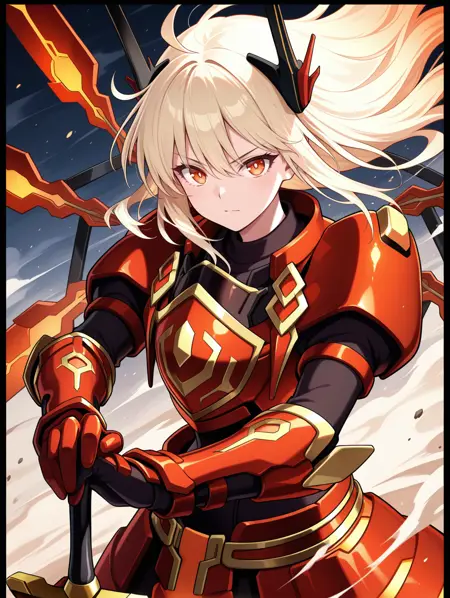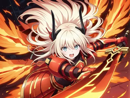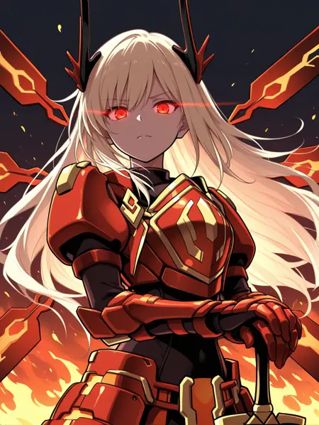 태그(옷 4): 빨간 파워 아머, 빨간 헤드기어, 빨간 장갑, 빨간 허벅지 부츠, 빨간 칼날 날개, 검은 스카프, 트윈테일, 뺨 붉음, 불, 검은 군복