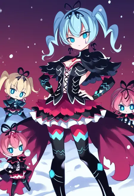 タグ(衣装):黒い髪リボン、黒いノースリーブドレス、黒い取り外し可能な袖、黒いタイツ、黒いイヤリング、黒いカペレット、青いネイル、黒い靴