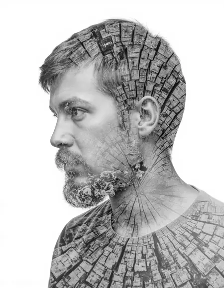 以 dan-mountford 风格创作的男子头部一侧为城市景观的双曝光照片