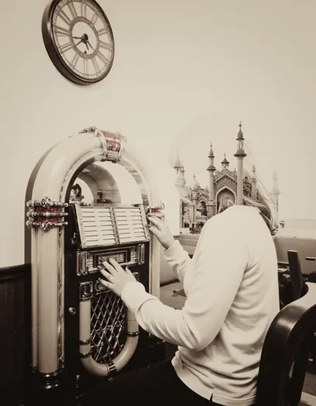 以 dan-mountford 风格创作的女子背景为大型摩天轮的双曝光照片
