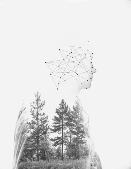 以 dan-mountford 风格创作的女子背景为森林场景的双曝光照片