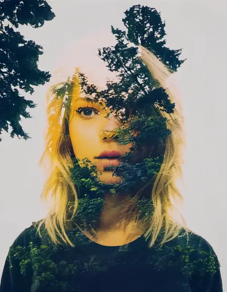 dan-mountford 스타일로 표현한 여자의 배경에 숲 풍경이 있는 더블 노출 사진