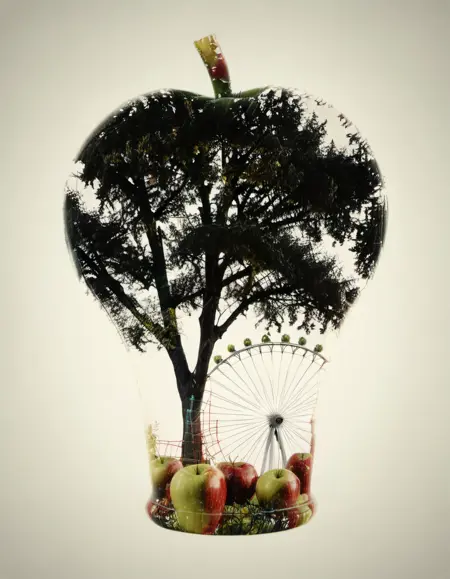 a double exposure photo of a woman with a large ferris wheel in the background in the style of dan-mountford