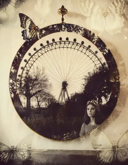 dan-mountford 스타일로 표현한 여자의 배경에 큰 관람차가 있는 더블 노출 사진