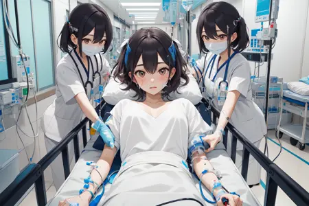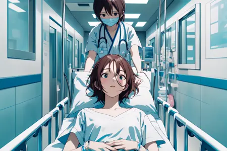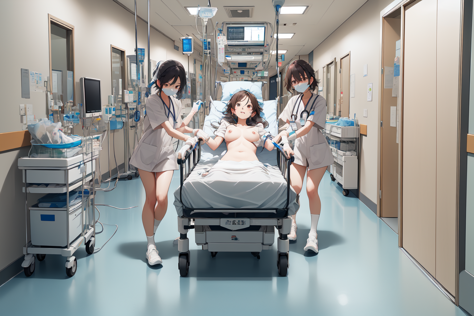 触发词为 "patient_on_gurney, hospital bed"。你还需要添加 "multiple girls" 以确保画出护士,毕竟患者自己无法推动推床。