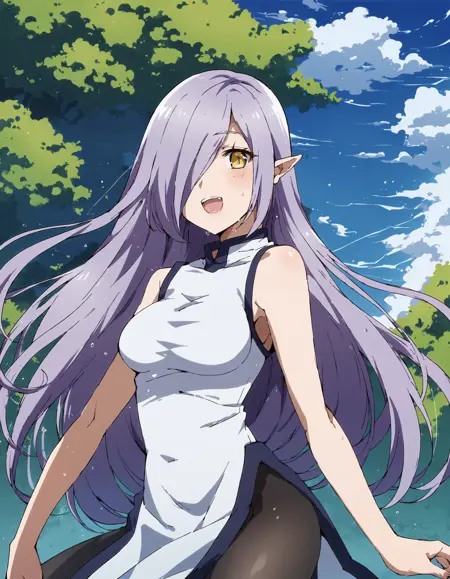 kyarotto_olis, 紫色の髪, 非常に長い髪, 片方の目に髪がかかる, 尖った耳, 黄色い目