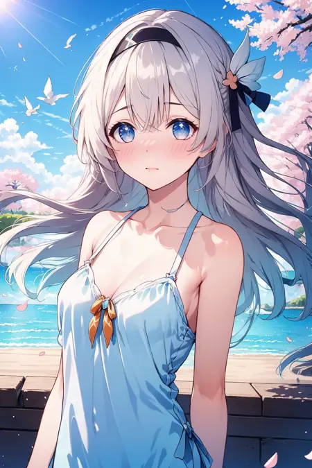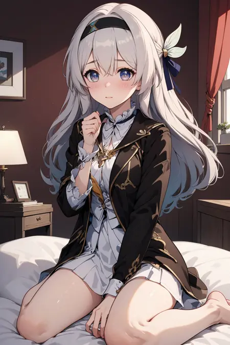 衣装や背景、アクションの変更が難しい場合、LoRAのウェイトを適宜下げてください。ウェイトを下げるとキャラクターの特徴が欠如する場合がありますので、その際はキャラクターの特徴キーワード【black hairband, grey hair】のウェイトを上げて特徴を固定してください。