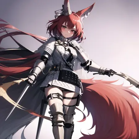 Flametail,origen,(aged down),armor,medium tail,(ear ornament:1.4),ear covers,thighhighs,armored boots,low ponytail,empty handed,standing,full body