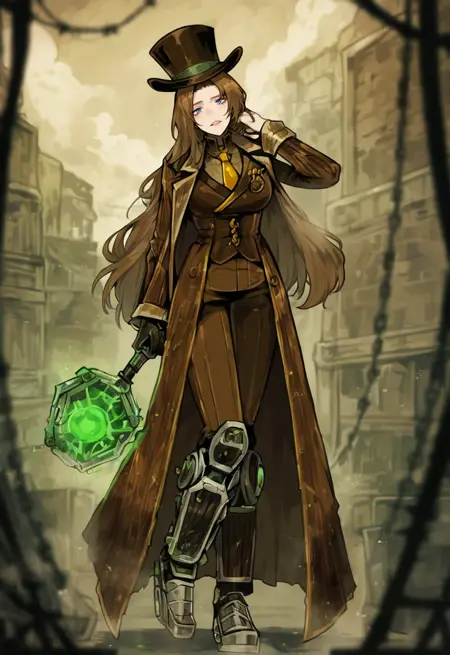 RodionTcorp,蒸汽朋克风格,棕色衬衫,黄色领带,棕色夹克,机械臂,棕色长裤,棕色圆顶礼帽,装甲鞋履