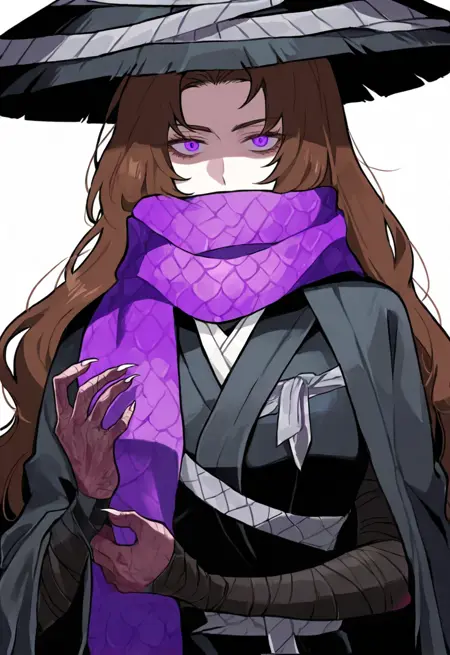 RodionHeishou,紫色眼睛,紫色蛇纹围巾,遮口,黑色亚洲斗笠,黑色长袍,灰色编织夹克,黑色长裤,黑色短斗篷,臂缠,绷带手臂,绷带腿部,黑色绷带,黑色鞋履