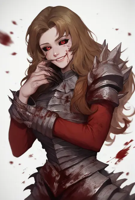 RodionBlood,红色礼服,骨制首饰,衣物上有骨头,黑色巩膜,红色眼睛,脸上有血迹,衣服上有血迹,手持斧头,武器上有血