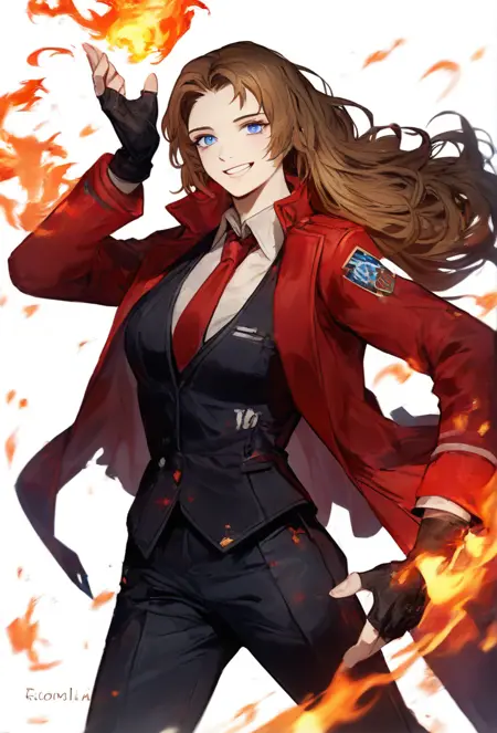 RodionLiu, 빨간 넥타이, 검은 베스트, 빨간 코트, 검은 바지, 흰 셔츠, 손가락 없는 장갑, 불