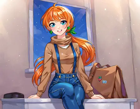 denim pants with suspenders, green earrings, brown sweatshirt,