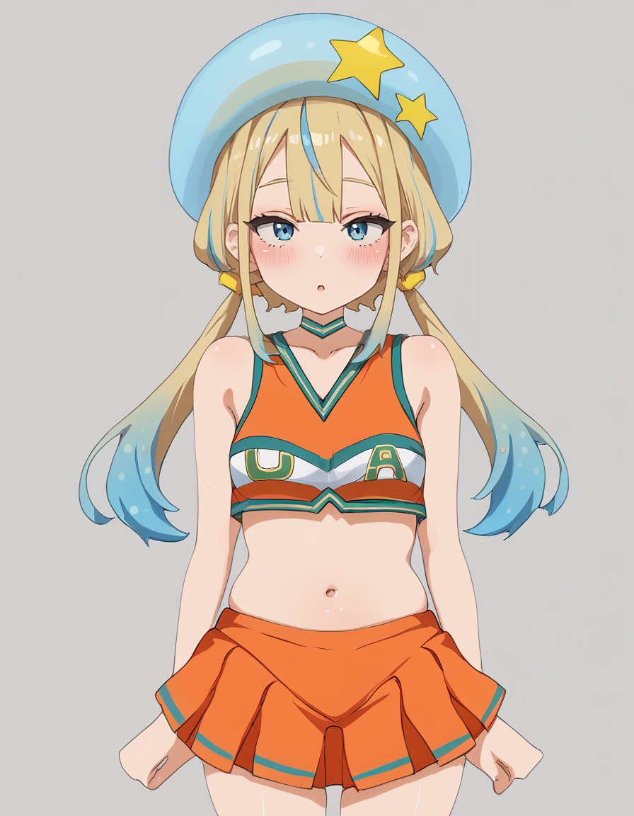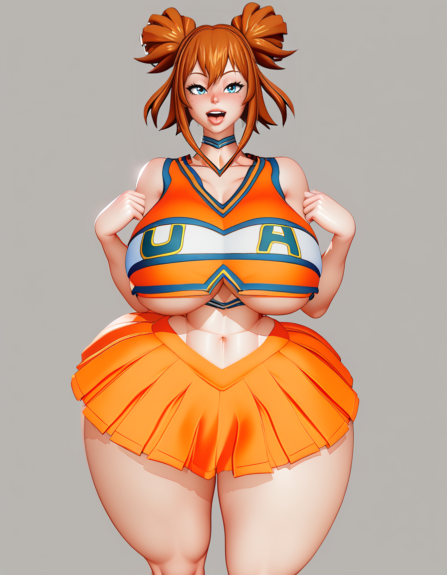 "uacheerlead, 1girl, cheerleader, navel,midriff, crop top, choker, orange skirt, pleated skirt,orange shirt"
