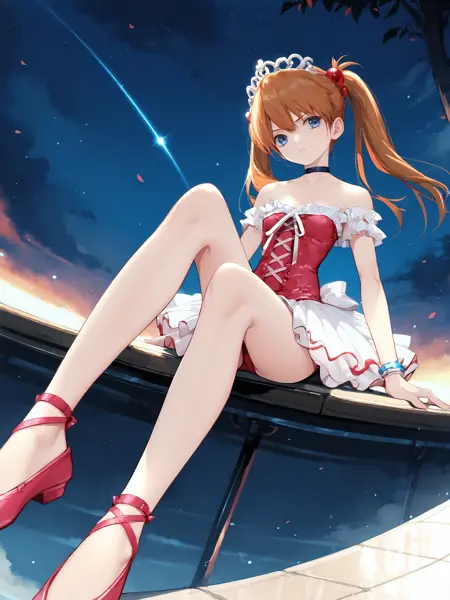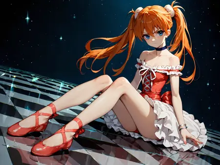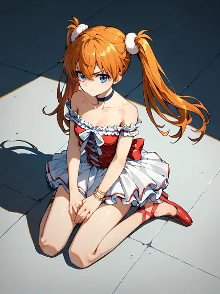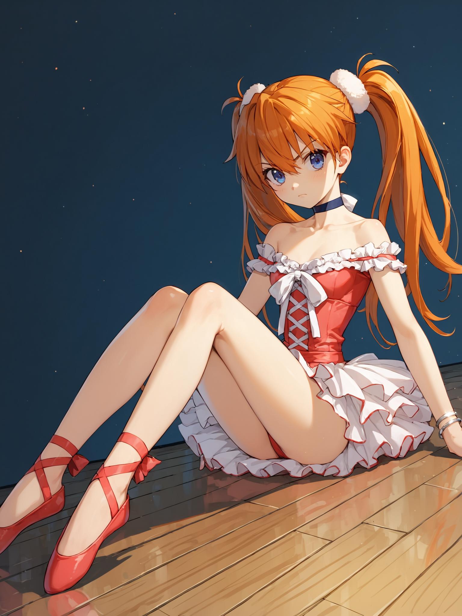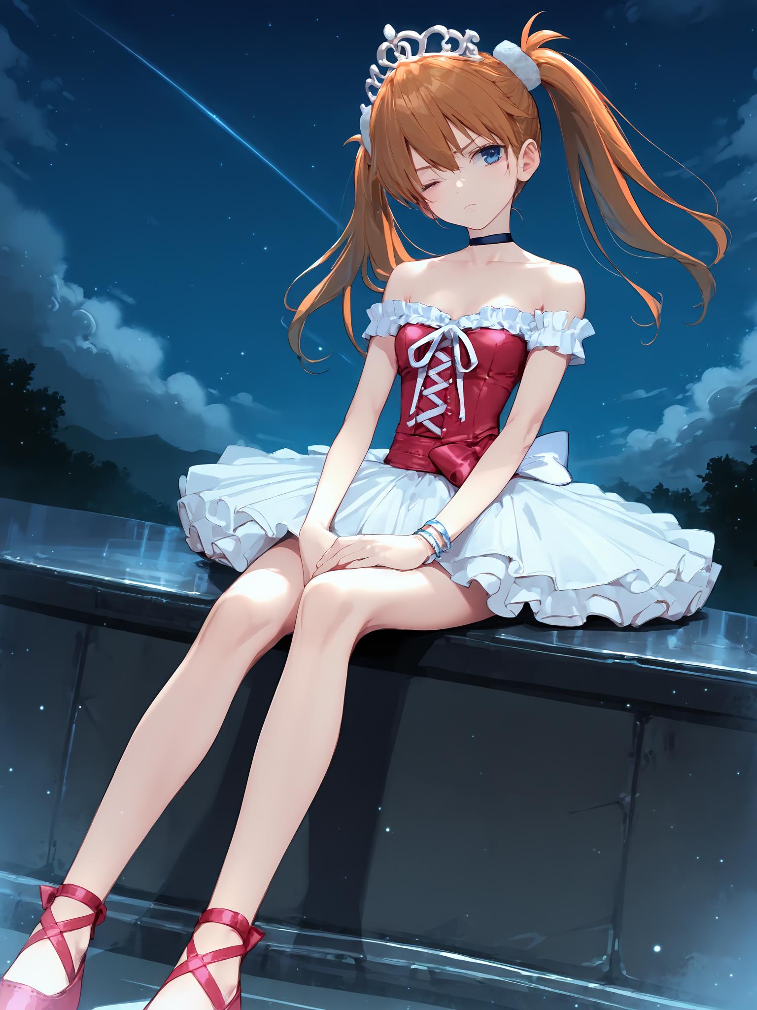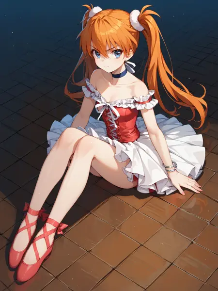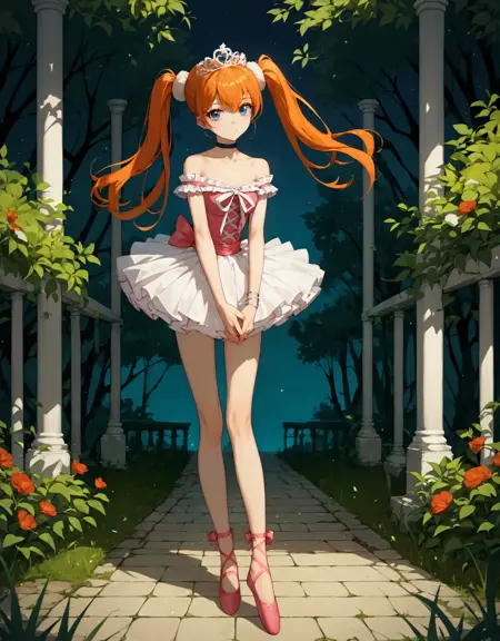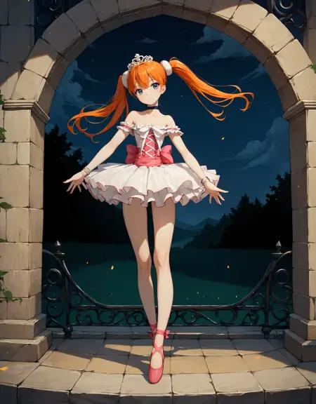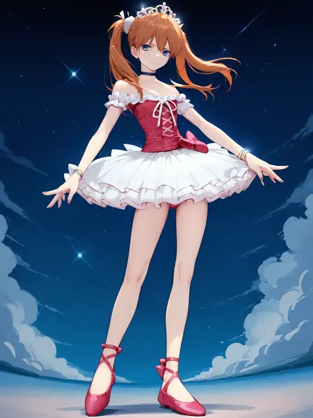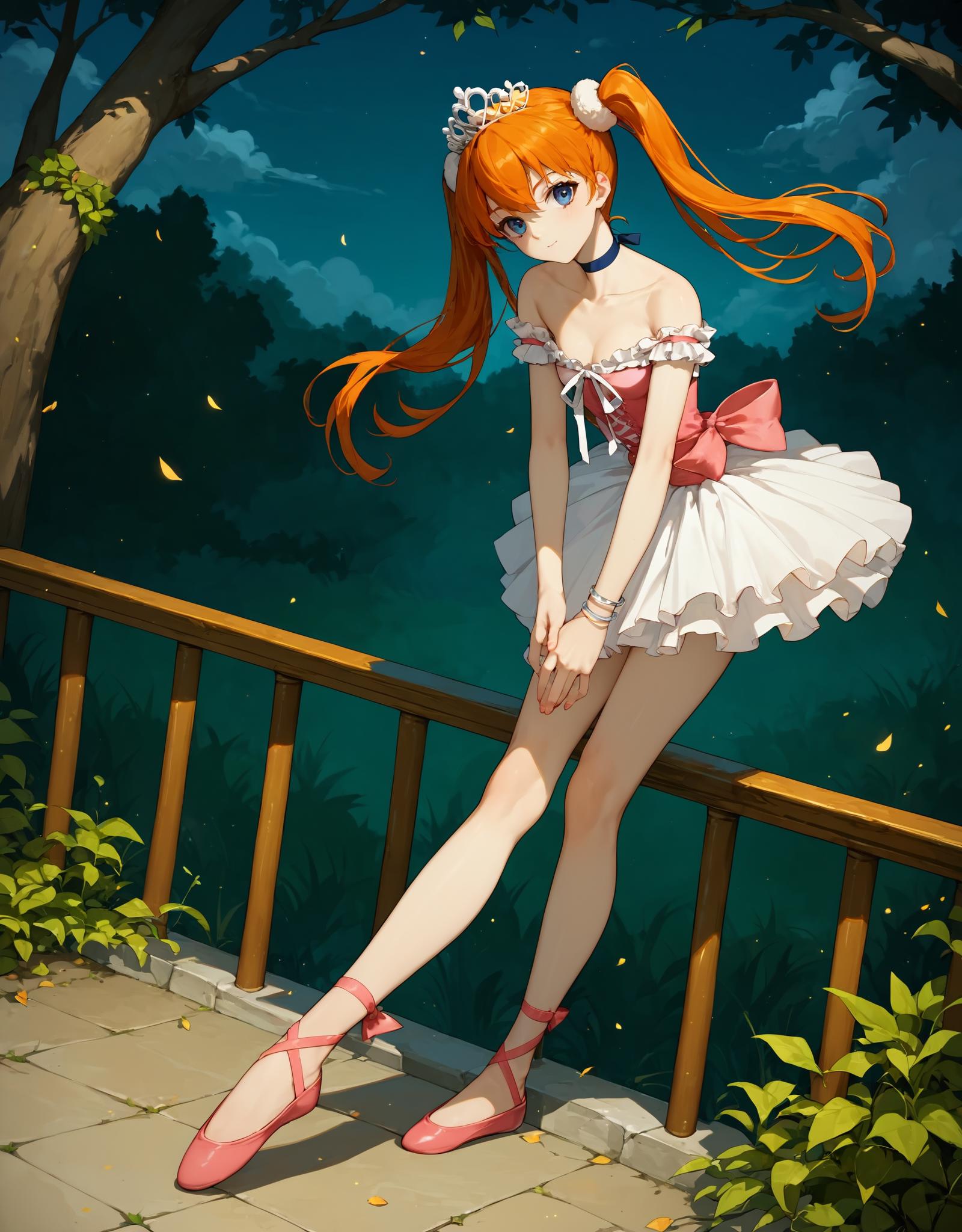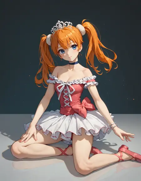 prompt: asuka_ballet,1girl,solo,pink ballet slippers,white tutu,blue eyes,long hair,choker,dress,jewelry,bare shoulders,ribbon,bracelet,footwear ribbon,frills,tiara,white hair ornament,ankle lace-up,off shoulder,bow,cross-laced footwear,orange hair,twintails,