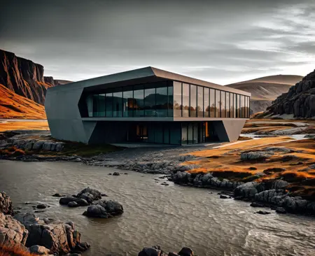 다음 토큰을 입력하는 것을 추천합니다: architecture, building, house, blackout, slate gray, epic lighting, glow, complex details, vegetation, raw, hdr, professional photo.