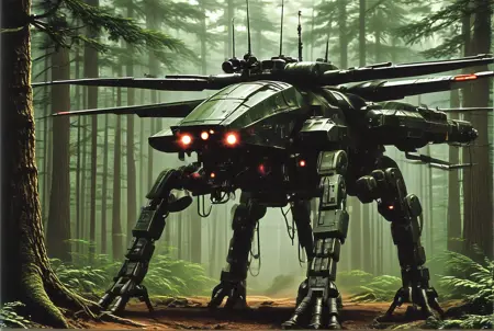 xjx style biotech, robot, mecha, science fiction, glowing, weapon, forest, tree, nature, glowing eyes, no humans
