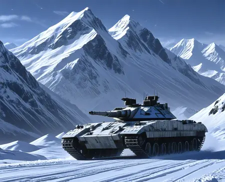 xjx style tank, snow, mountain, no humans, military, ground vehicle, science fiction, military vehicle, motor vehicle, sky, scenery