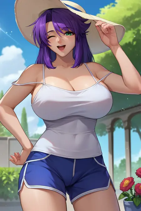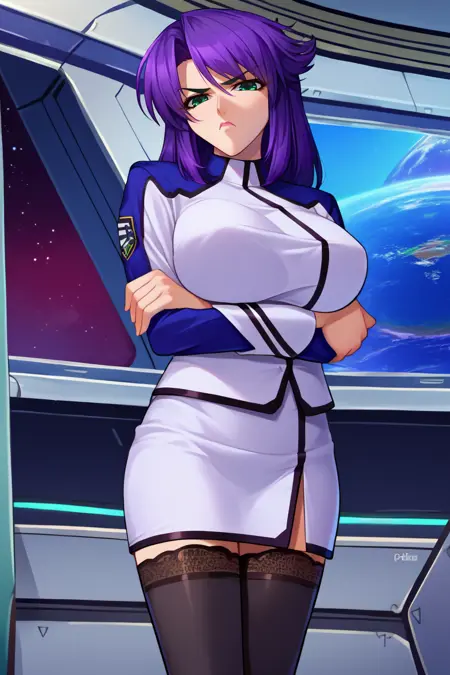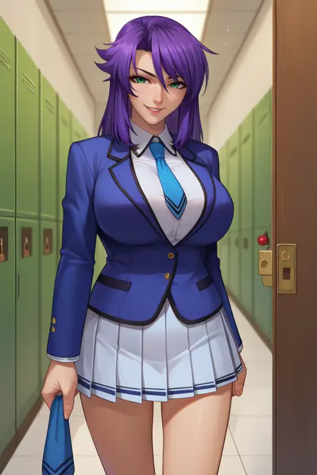 그녀의 전형적인 외모를 표현하려면 "보라색 및 흰색 유니폼, 흰 치마, 검은 히프하이"를 추가하세요.