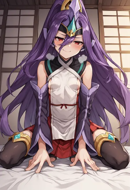 极长发、紫发、红眼、高马尾、发饰、王冠、珠宝、和服、神社巫女、侧乳、飘逸袖子、裙子、大腿靴