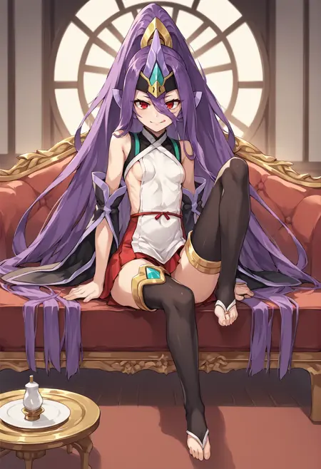 very long hair, purple hair, red eyes, high ponytail, hair ornament, crown, jewelry, japanese clothes, miko, sideboob, detached sleeves, skirt, Thigh Boots