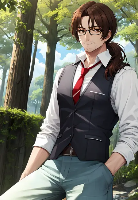 長い髪、茶色の髪、茶色の目、ポニーテール、男性中心、眼鏡、顎ひげ、ひげ剃り残し