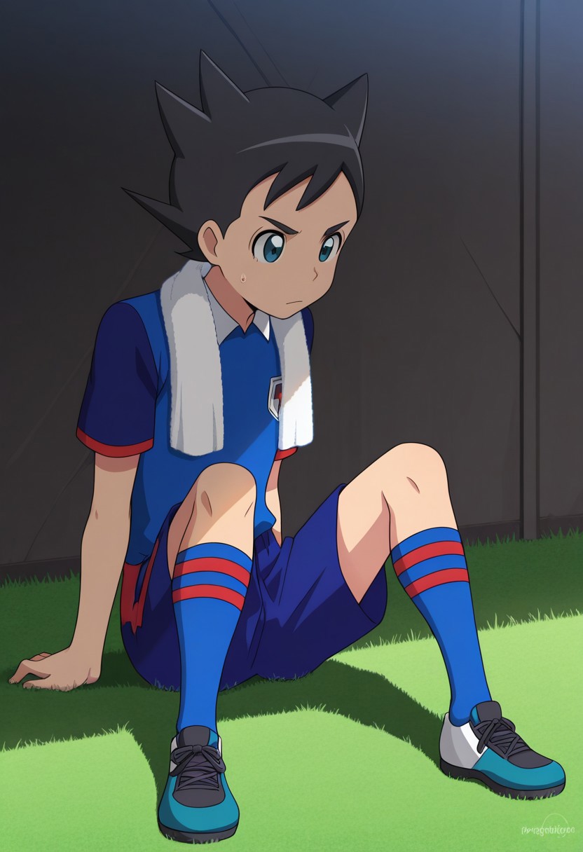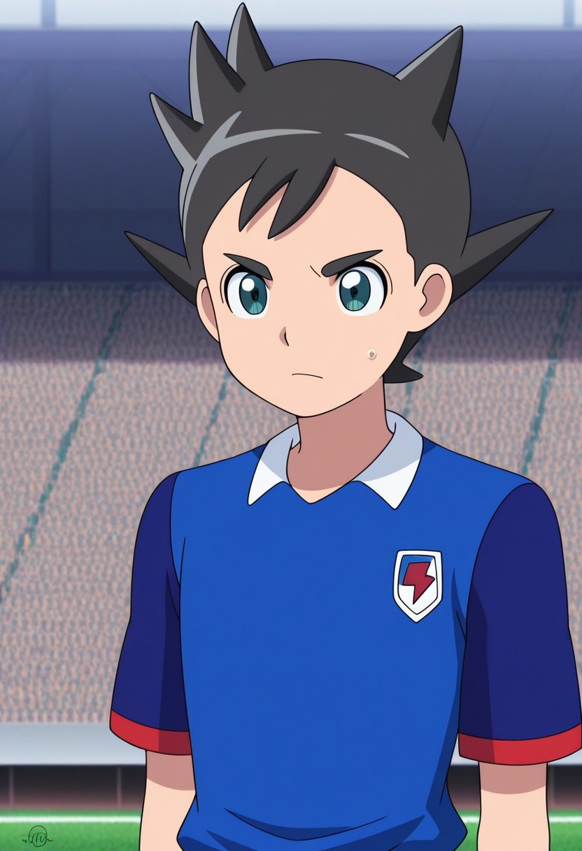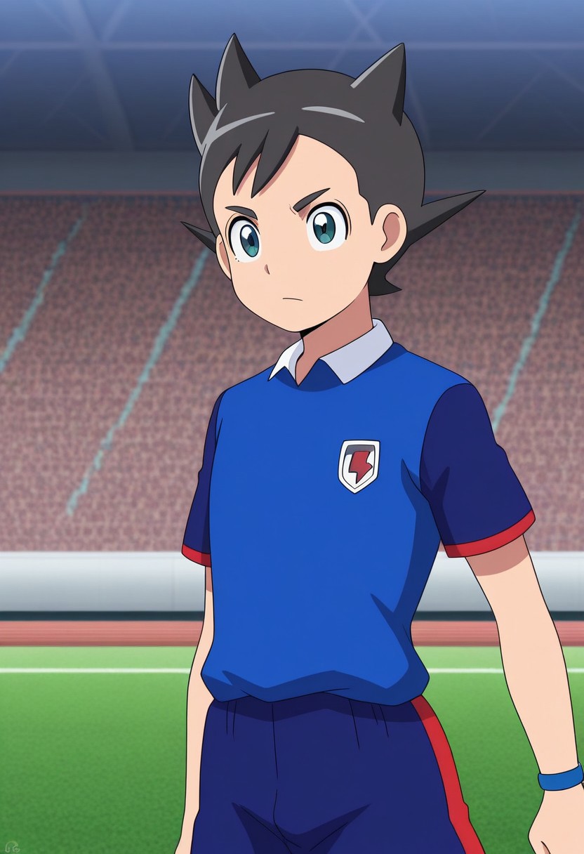 InamoriAsuto, 1boy, male focus, solo, green eyes, black hair, spiked hair, orion soccer uniform, shirt, blue shirt, raglan sleeves, short sleeves, shorts, blue shorts, socks, blue socks, shoes, sneakers,
