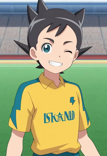 InamoriAsuto, 1boy, male focus, solo, green eyes, black hair, spiked hair, inakumi soccer uniform, shirt, yellow shirt, short sleeves, bracelet, shorts, aqua shorts, socks, aqua socks, shoes, sneakers