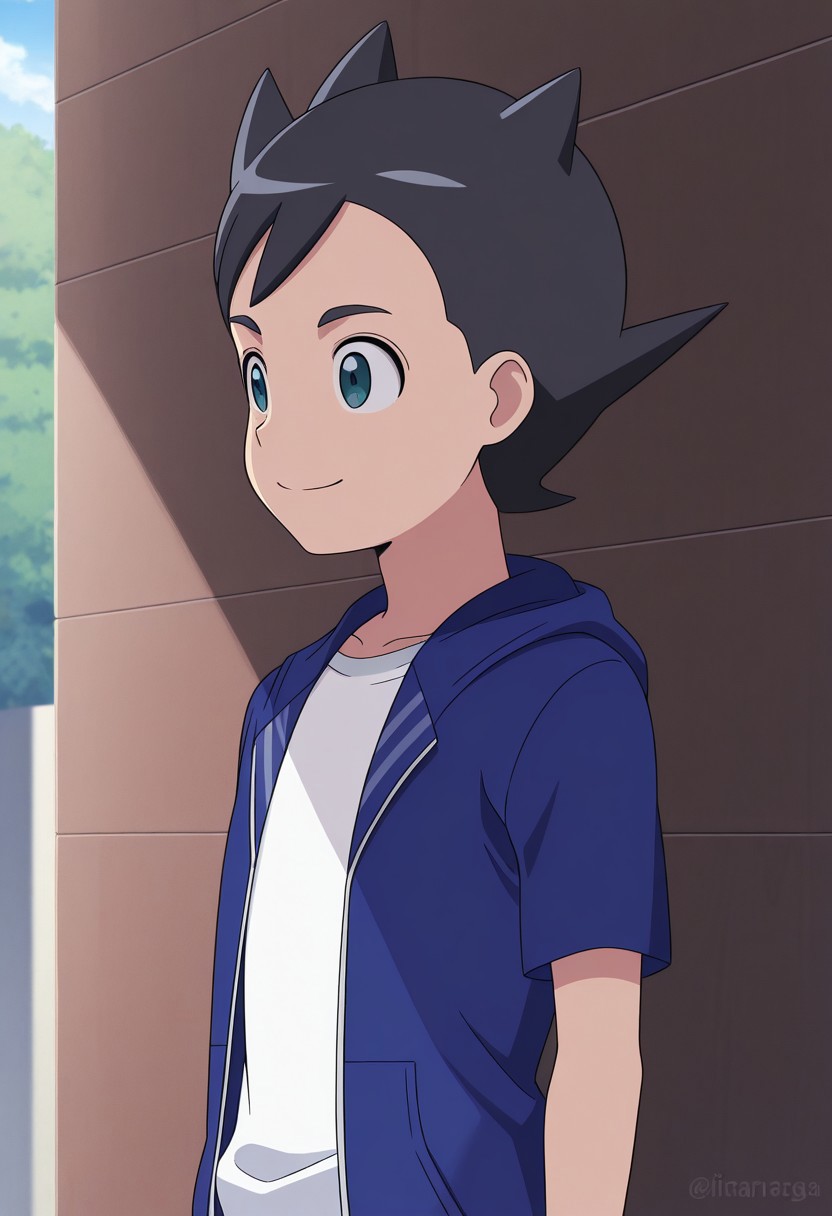 InamoriAsuto, 1boy, male focus, solo, green eyes, black hair, spiked hair, shirt, white shirt, hoodie, blue hoodie, hood, short sleeves, open hoodie, shorts, black sorts, shoes, white footwear,