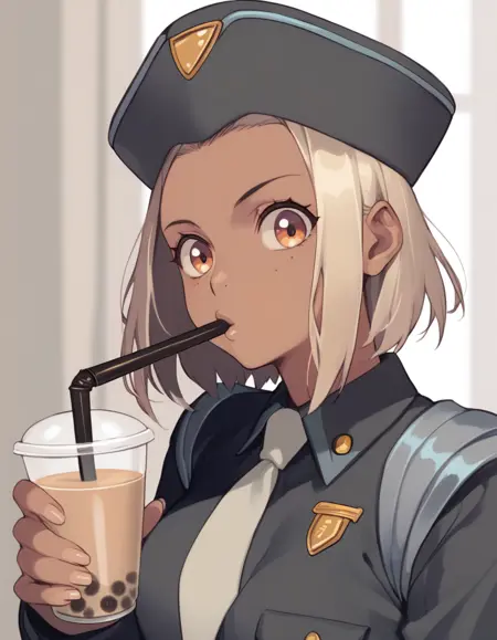 옷차림: 모자, 군복, 넥타이, 팬티스타킹